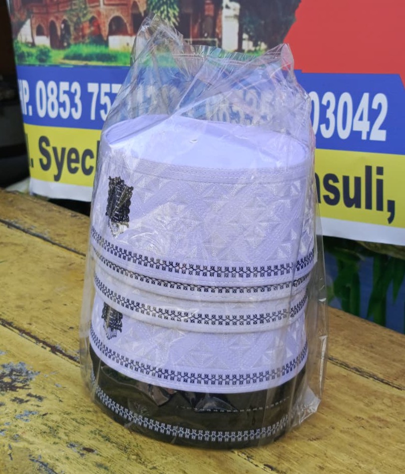 Peci formal berjenis kopiah kaku dengan desain klasik dan berwibawa. Bagian badan peci memiliki pola timbul (embossed) yang elegan. Aksen sulaman hitam yang kontras di bagian bawah memberikan sentuhan rapi dan tegas. Tersedia dalam warna Putih Bersih dan Hitam Pekat. Ideal untuk ibadah, haji, atau acara resmi.